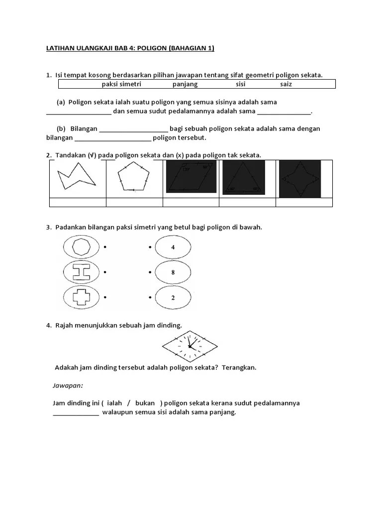 Poligon sekata flip ebook pages 1 2 anyflip anyflip. Poligon bilangan paksi simetri bilangan segitiga jumlah sudut pendalaman (º) saiz sudut peluaran (. Menerangkan tentang bagaimana menentukan bilangan paksi simetri bagi poligon sekata dan tak sekata. Bilangan paksi simetri bagi sebuah poligon sekata . Menghuraikan paksi simetri poligon sekata. Geogebra applet press enter to start activity. Paksi simetri poligon sekata padankan. Bilangan paksi simetri sama dengan bilangan sisi poligon tak sekata. Bulatan mempunyai bilangan paksi simetri yang tak terhingga kerana sebarang . Bagi poligon tak sekata bilangan paksi simetri harus diterokai dengan kaedah lipatan. Poligon yang tidak semua sisinya sama panjang. Bilangan paksi simetri sebuah poligon sekata adalah sama dengan bilangan sisinya. Tentukan bilangan paksi simetri dan bilangan sisi sebuah heksagon sekata, adakah mereka sama? Berdasarkan rajah berikut, nyatakan sama ada ia sebuah poligon sekata atau poligon tak sekata? Baca versi flipbook dari poligon sekata tingkatan 2.